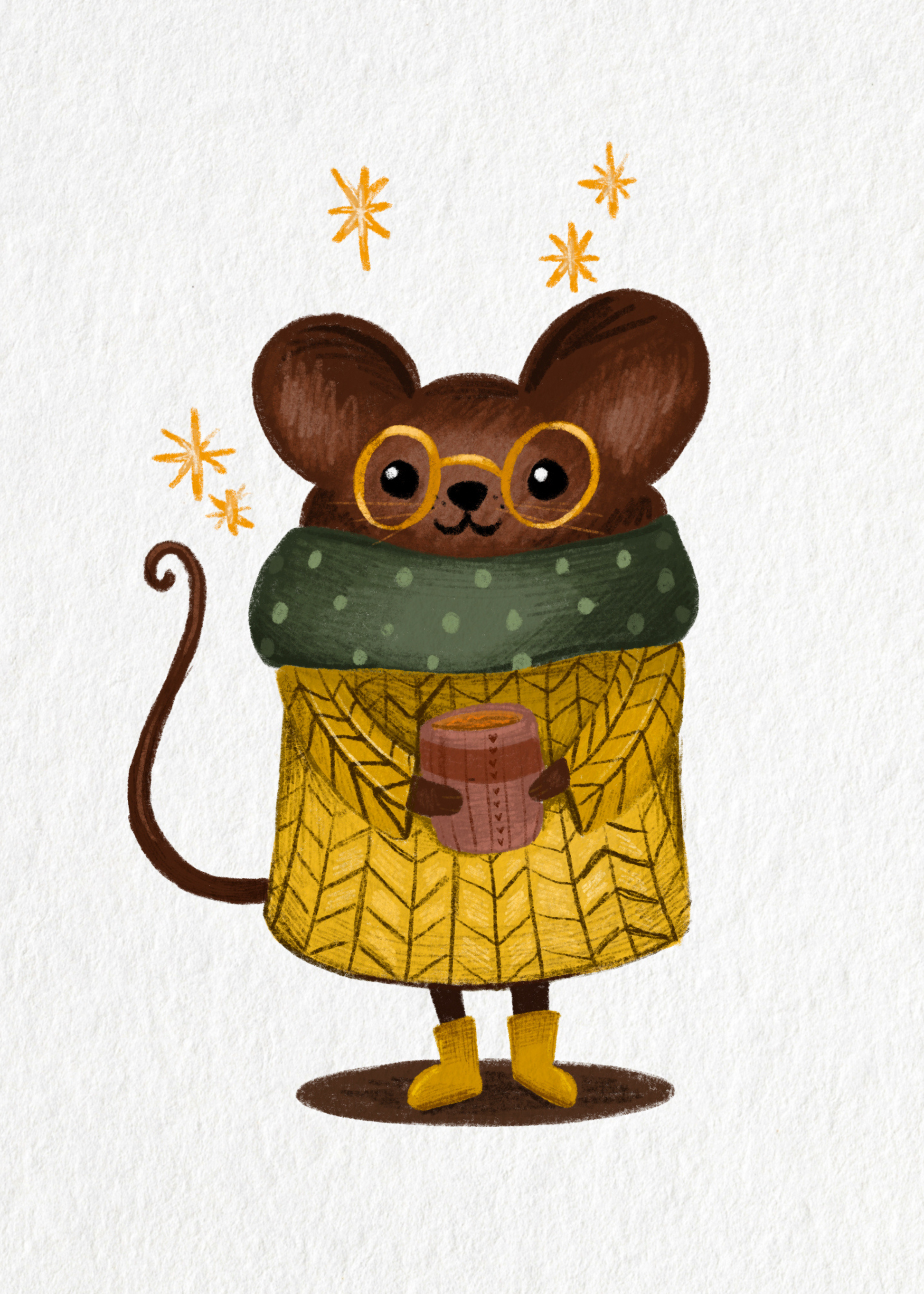 Wrapped in a golden sweater, cozy scarf, and boots, Goldie the fall mouse is ready for crisp autumn days with a warm drink in hand. This charming little character brings the simple joys of fall—coziness, warmth, and a touch of magic—into one heartwarming piece.